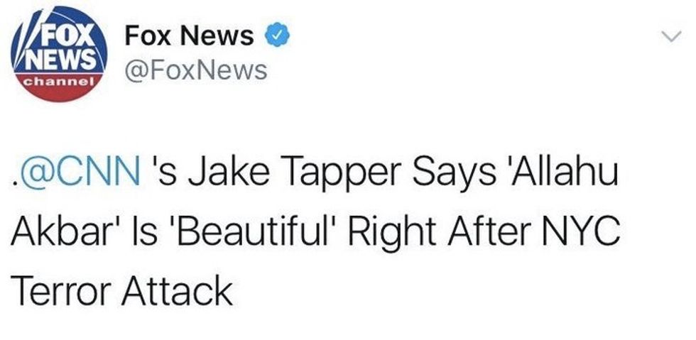Fox News tweeted a lie by twisting CNN's Jake Tapper's words around in a tweet he posted in the wake of New York City's recent terrorist attack.