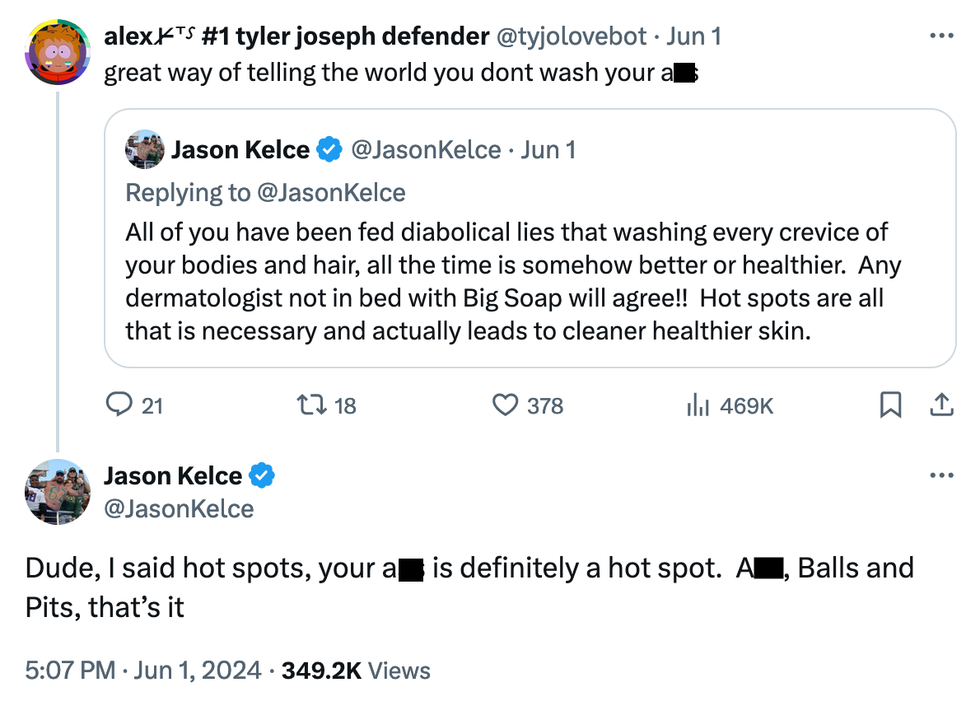 And when a user accused Kelce of basically announcing to the world that he doesn't wash his backside, Kelce clarified: