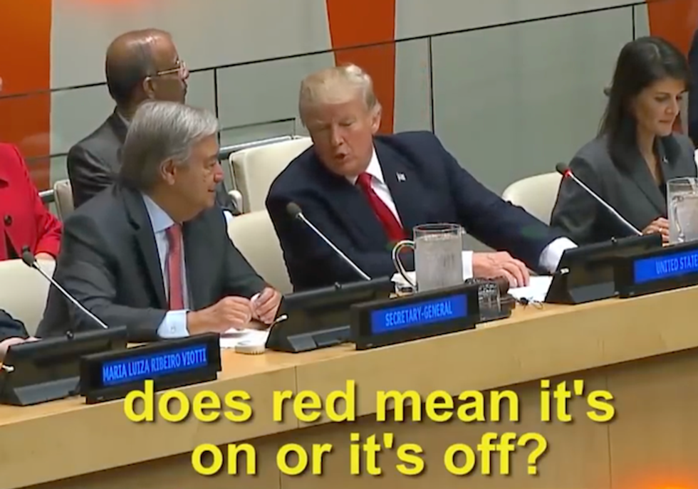The overwhelmed commander in chief had little knowledge of how to command the console in front of him, and was caught on camera leaning over to the organization’s Secretary-General António Guterres and asking him, "Does red mean it’s on, or it’s off?"