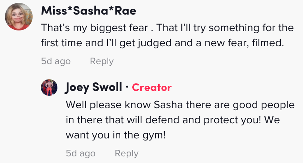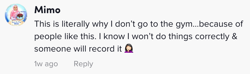Several people chimed in their biggest fear was being filmed and made fun of at the gym--causing them to avoid it altogether.