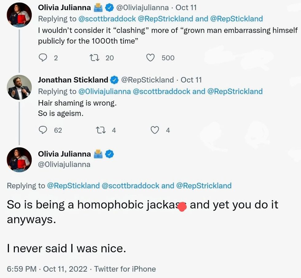 \u201cWell folks, seems like we\u2019ve got another GOP politician who thinks body shaming me is a good idea (mixed with some homophobia)\u2014 but this time he\u2019s from Texas. \n\nLast time we raised $2.2 million for abortion funds. Can we raise $50K for Texas Democrats???? \n\nThanks @RepStickland\u201d— Olivia Julianna \ud83d\uddf3 (@Olivia Julianna \ud83d\uddf3) 1665416279