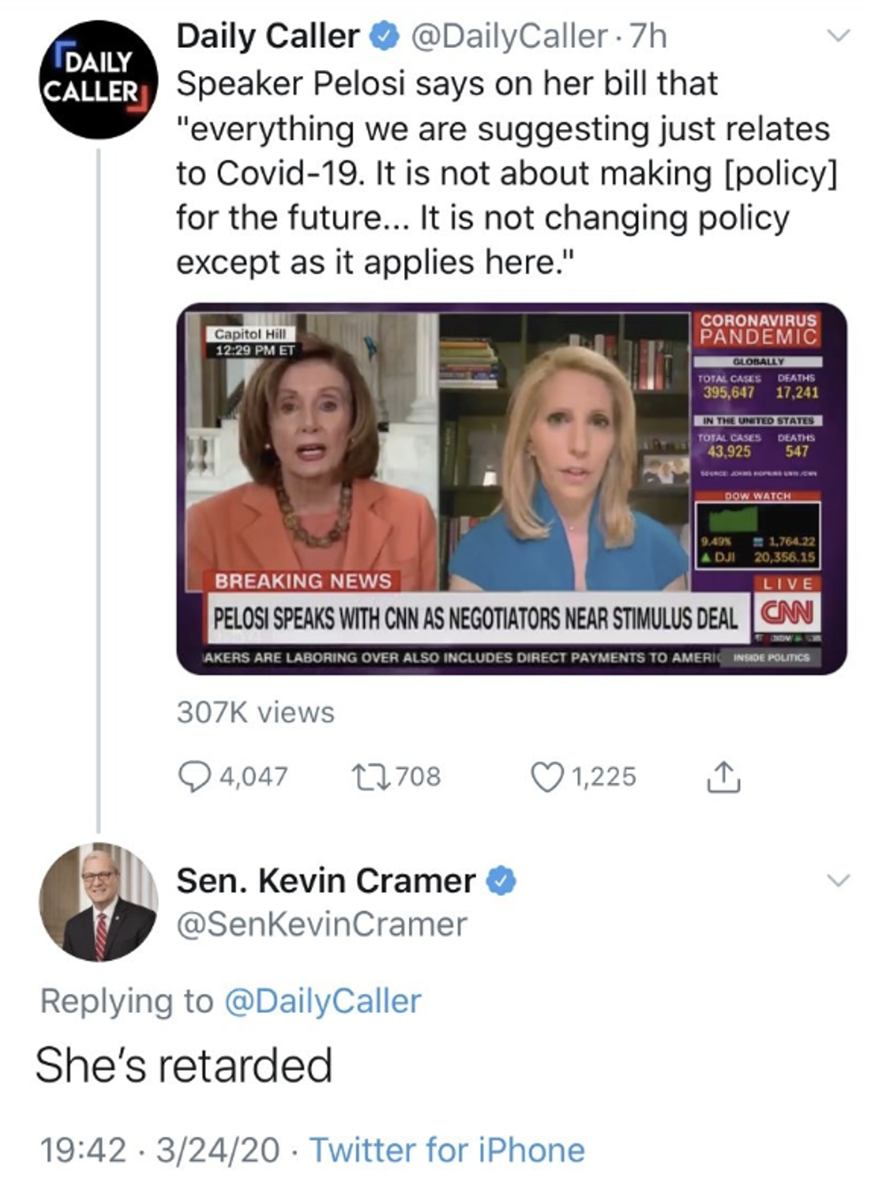 On March 24, sitting United States Senator Kevin Cramer—a Republican from North Dakota—responded to right wing news outlet Daily Caller's headline about Speaker of the House Nancy Pelosi.