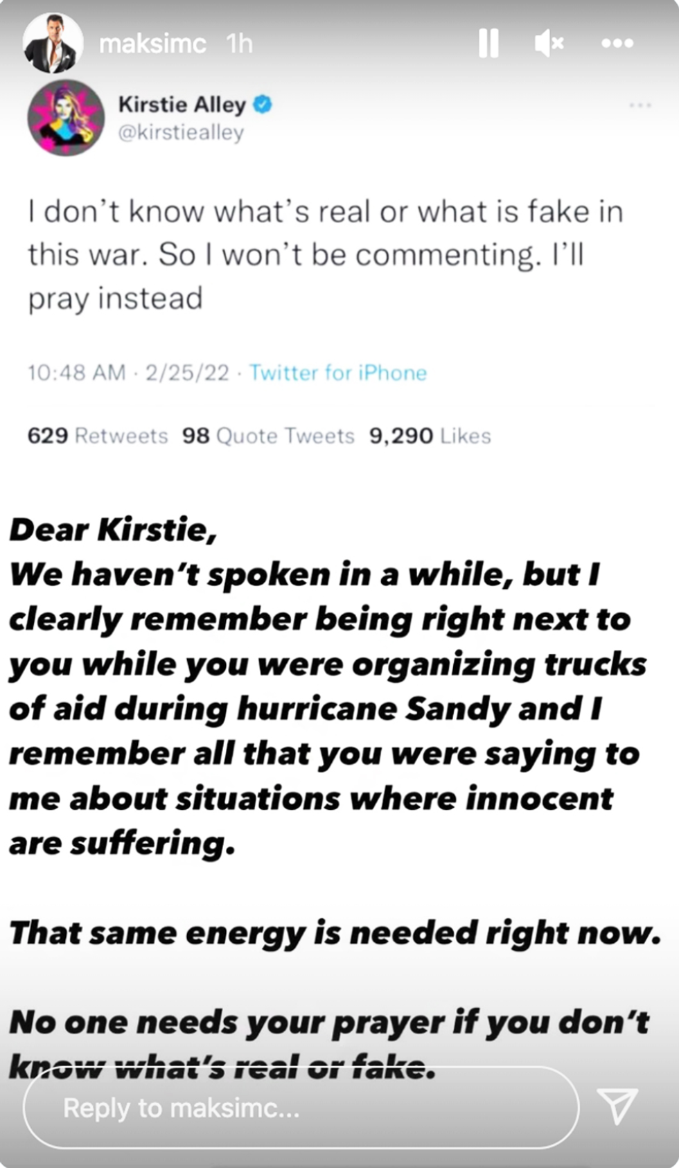 One of his posts was his response to Alley's tweet in which the 71-year-old actress said wasn't being vocal about the overseas conflict because "I don’t know what’s real or what is fake in this war."