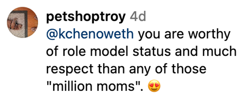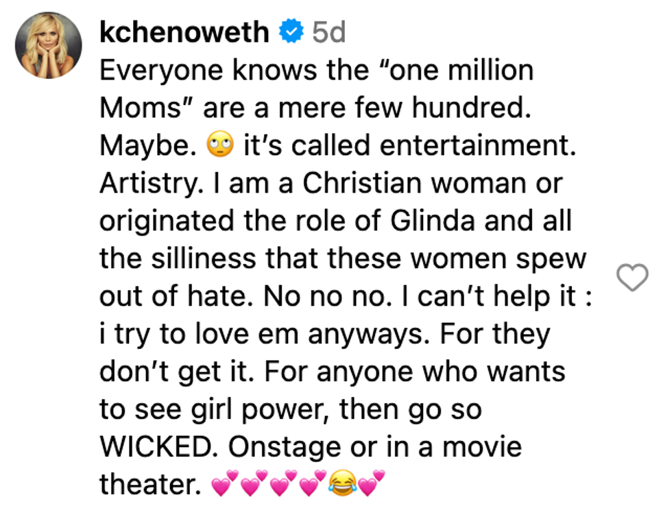 "Everyone knows the 'one million Moms' are a mere few hundred. Maybe," wrote Chenoweth. "it’s called entertainment. Artistry."