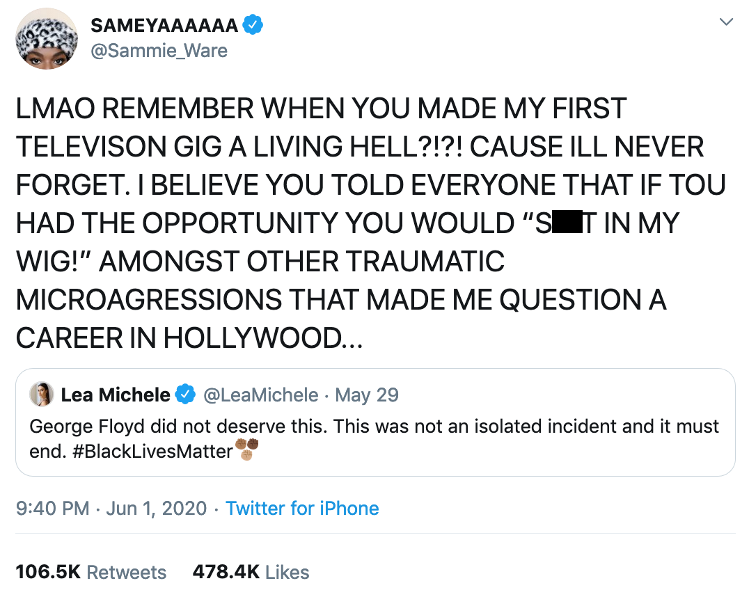 But Ware—who played "Jane Hayward" on the sixth season of Glee for 11 episodes in 2015—was unconvinced of her past costar's sincerity and wrote an all-caps tweet reminding Michele that she made her time on set together "a living hell."