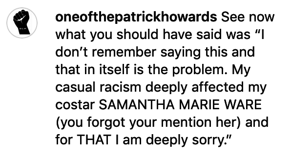 "But the responses I received to what I posted have made me also focus specifically on how my own behavior towards fellow cast members was perceived by them."