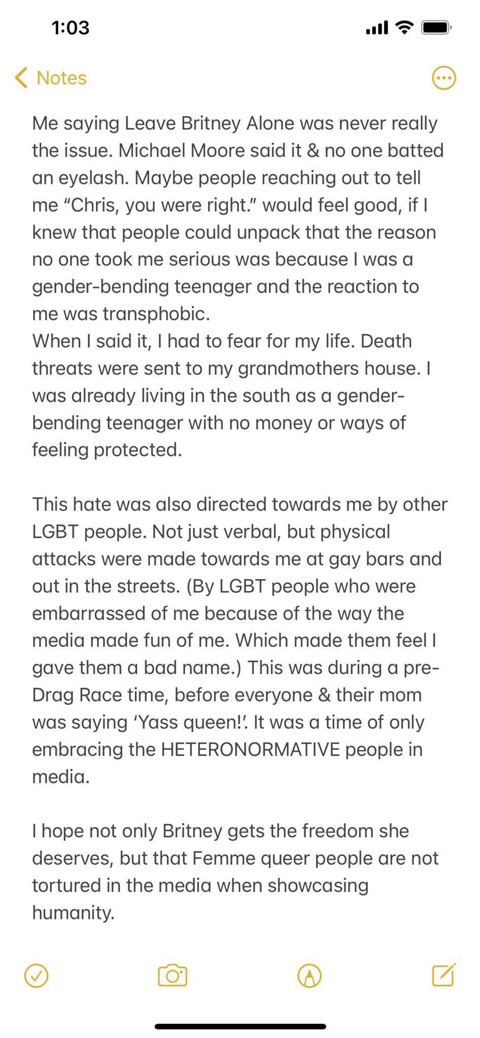 The note ends wishing well for Spears, but also for better treatment for people who don't fit in heteronormative society. It's about time the internet appreciates Chris Crocker.