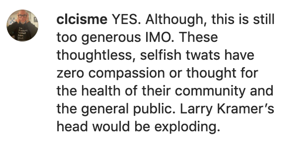 Over on Instagram, an account called @GaysOverCovid—which tracks LGBTQ events and people who ignore gathering restrictions during the pandemic—chastised the event with a meme that read: