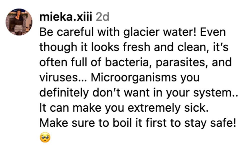 One Instagrammer noted how "Drinking water directly from glaciers might seem like a pure and pristine source, but it can be risky."