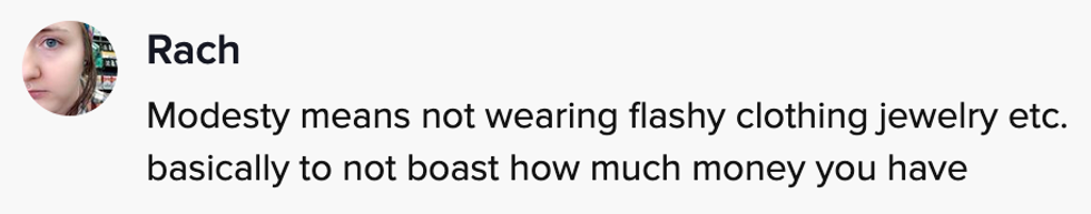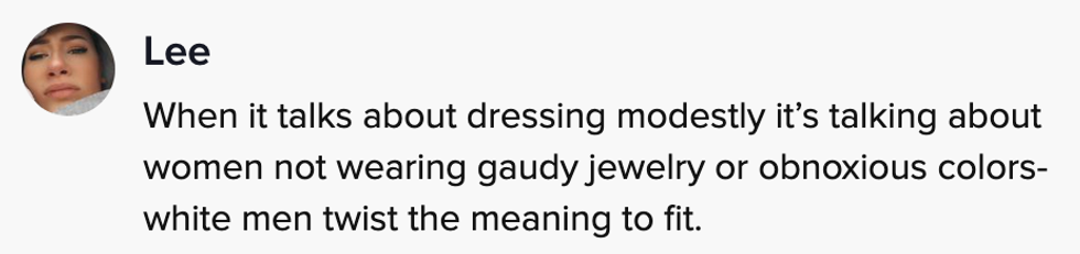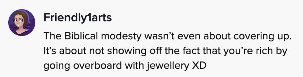"I also want the women to dress modestly, with decency and propriety, adorning themselves, not with elaborate hairstyles or gold or pearls or expensive clothes."