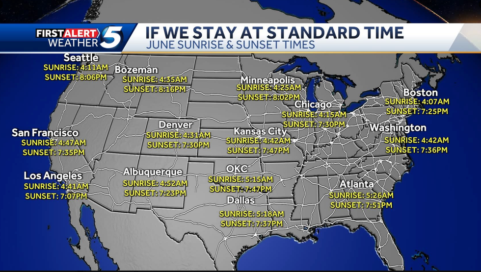 "If we eliminate the 'advancing the clocks 1 hour' in March, then this is what June will look like with sunrise and sunsets," he wrote and added the following nationwide graphic demonstrating how the US would appear staying at standard time during the month of June.