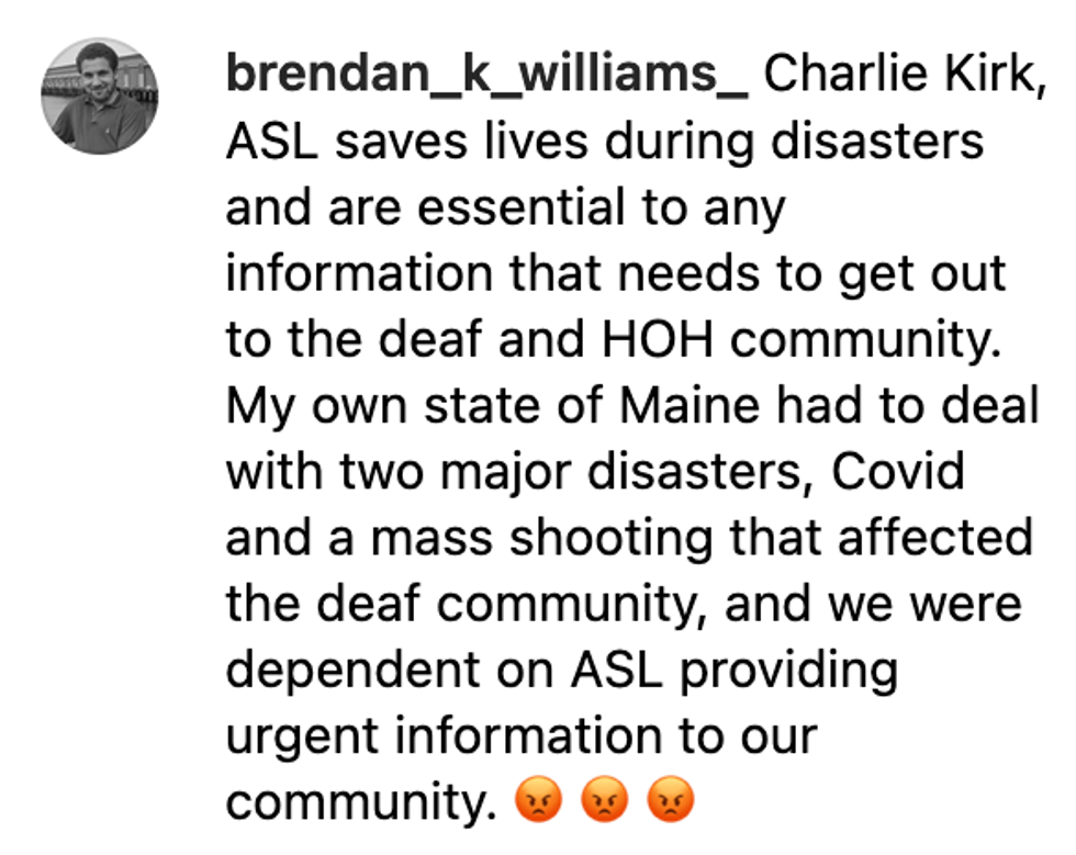 While news stations provided American Sign Language (ASL) interpreters to relay important emergency information during news conferences, Kirk groused about them as distractions.