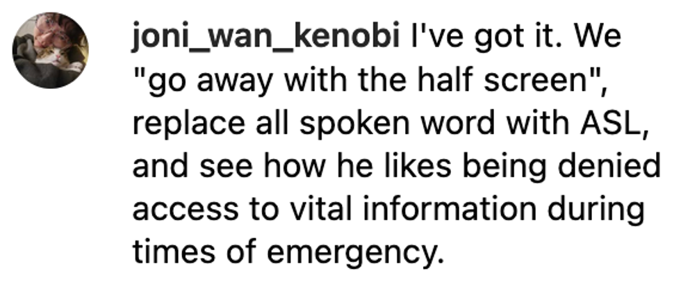“Can we please just go away with half the screen during these emergency briefings to the sign language interpreters? I have nothing against, obviously, people that cannot hear, but there’s closed captioning."