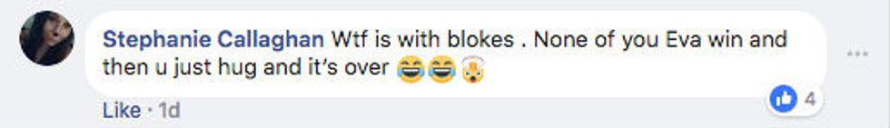 These two feisty Australians, who were just madly grappling with one another moments before, then hug it out—their beef effectively squashed.