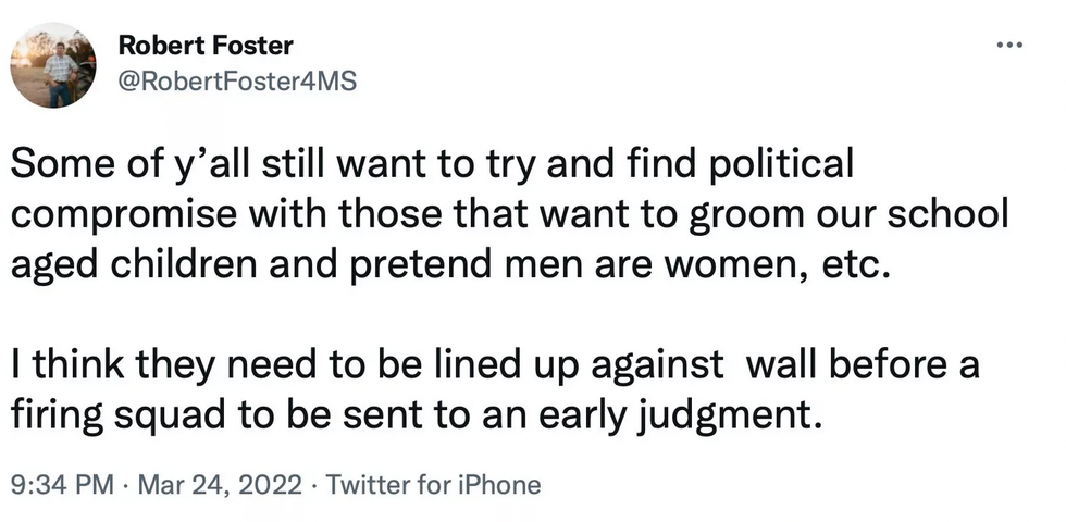 In the tweet, Foster, an evangelical Christian who runs an agritourism business called Cedar Hill Farm, also equated LGBTQ activism with pedophilia while calling for a "firing squad" for trans supporters--a form of execution that is legal in Mississippi thanks to legislation Foster wrote during his time in the state House.