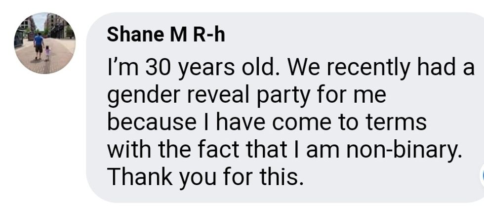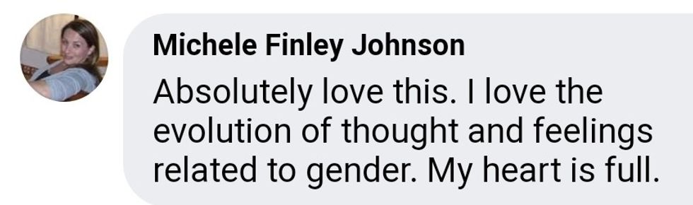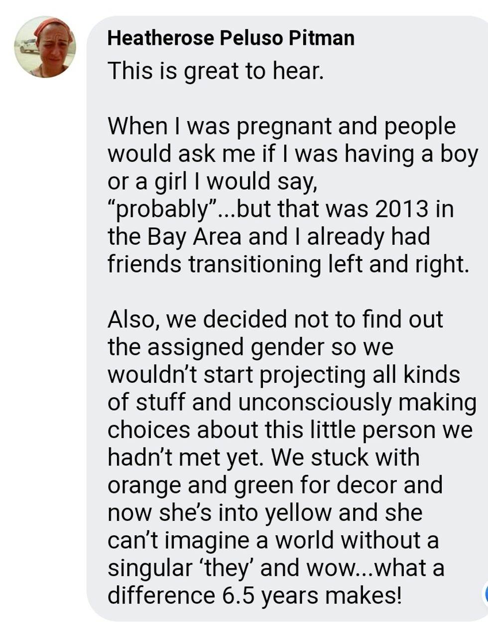 "Who cares what gender the baby is? I did at the time because we didn't live in 2019 and didn't know what we know now - that assigning focus on gender at birth leaves out so much of their potential and talents that have nothing to do with what's between their legs."