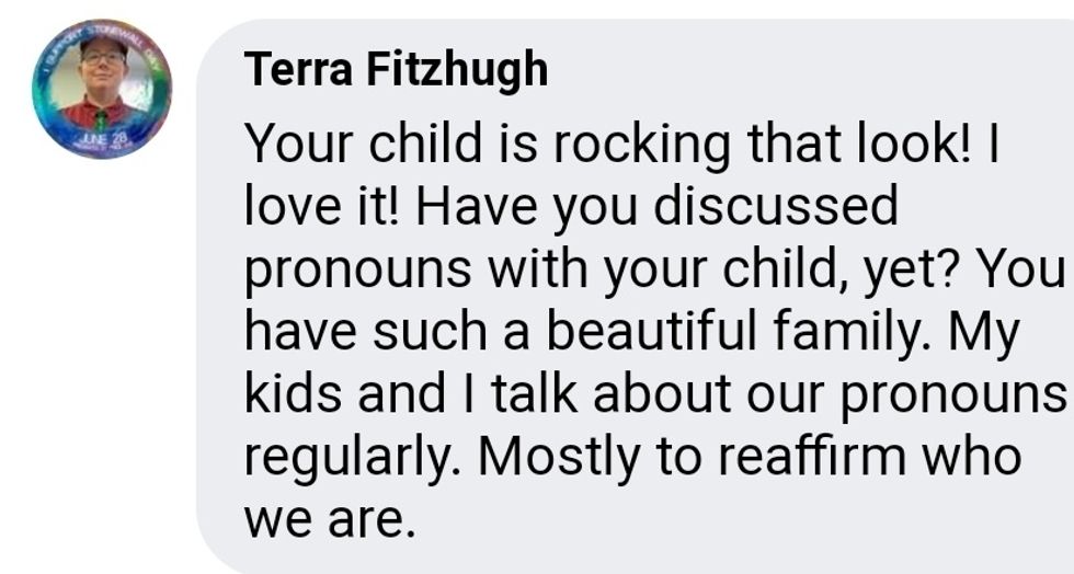 "I'm letting [Bianca] lead me. She has her opinions about there being many genders, and she is informing me about things. She was biologically born a female, and she is still 'she' and 'her' and says she's a girl, but she is still doing [gender expression] her way."