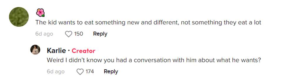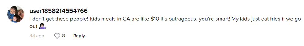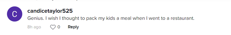 Karlin, or @unbreakablemomma on TikTok, shared her solution, which instead involved bringing her own food into the restaurant for her child instead of sharing her order.