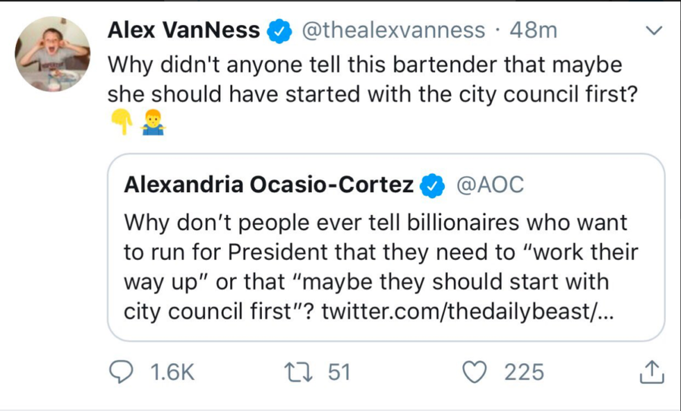 Ocasio-Cortez, who worked as a bartender before running for office, pointed out that she has, among other things, "served in a Senate casework office, organized and educated thousands of young people," and only didn't run for city council because she was discouraged from running at all.