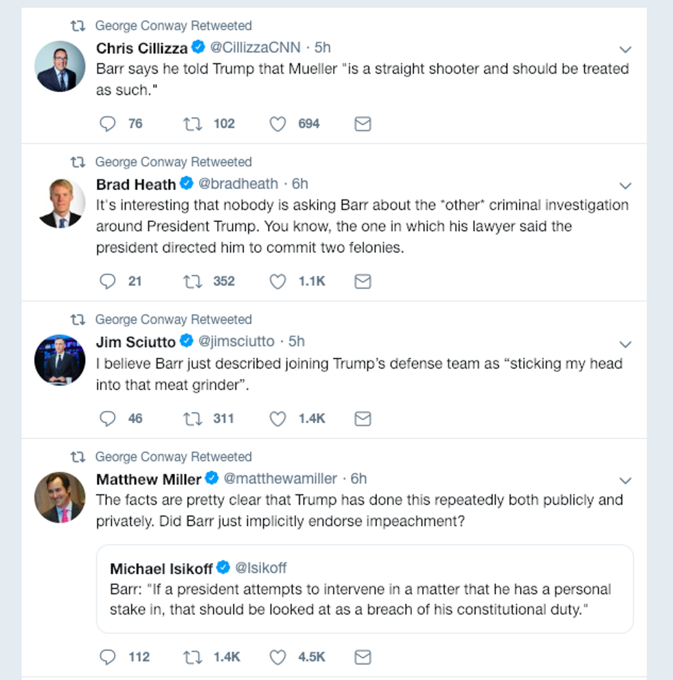 Conway also retweeted news of Barr's opening statement to lawmakers, in which he assured them he would not interfere with Mueller's investigation...