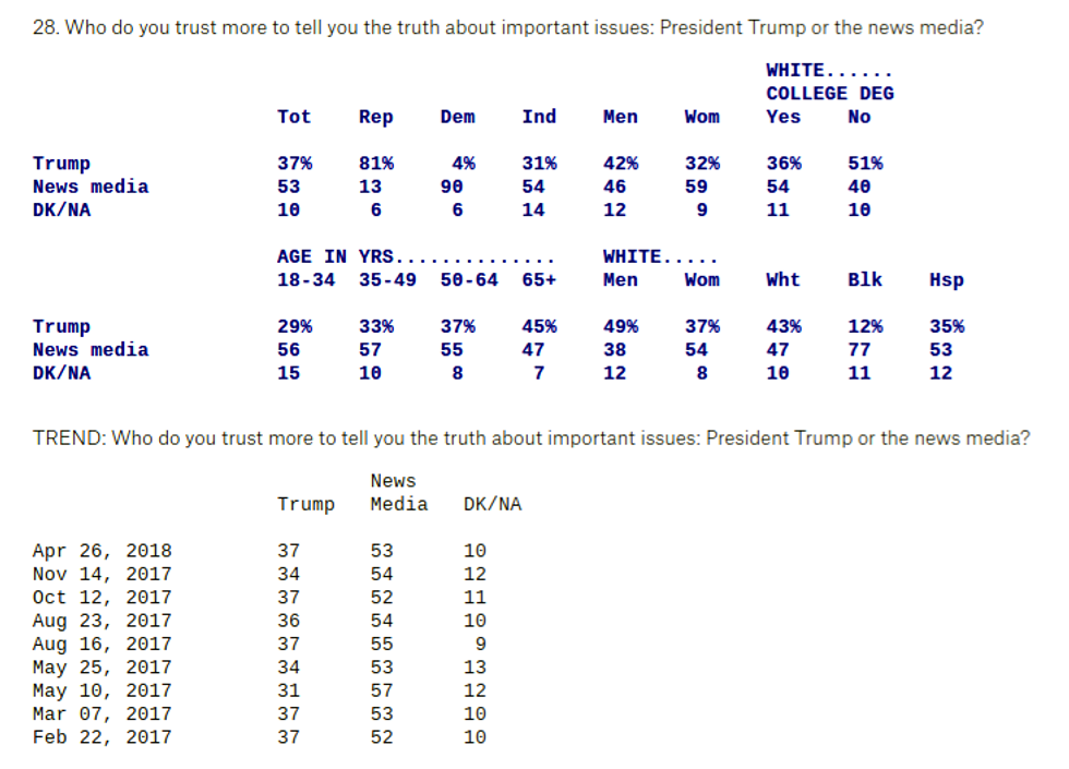 Other respondents stated a belief that "The news media is an important part of democracy, 66 percent of American voters say, while 22 percent say the media is the enemy of the people. (The majority of) Voters trust the media more than President Trump 53 - 37 percent to tell the truth about important issues."