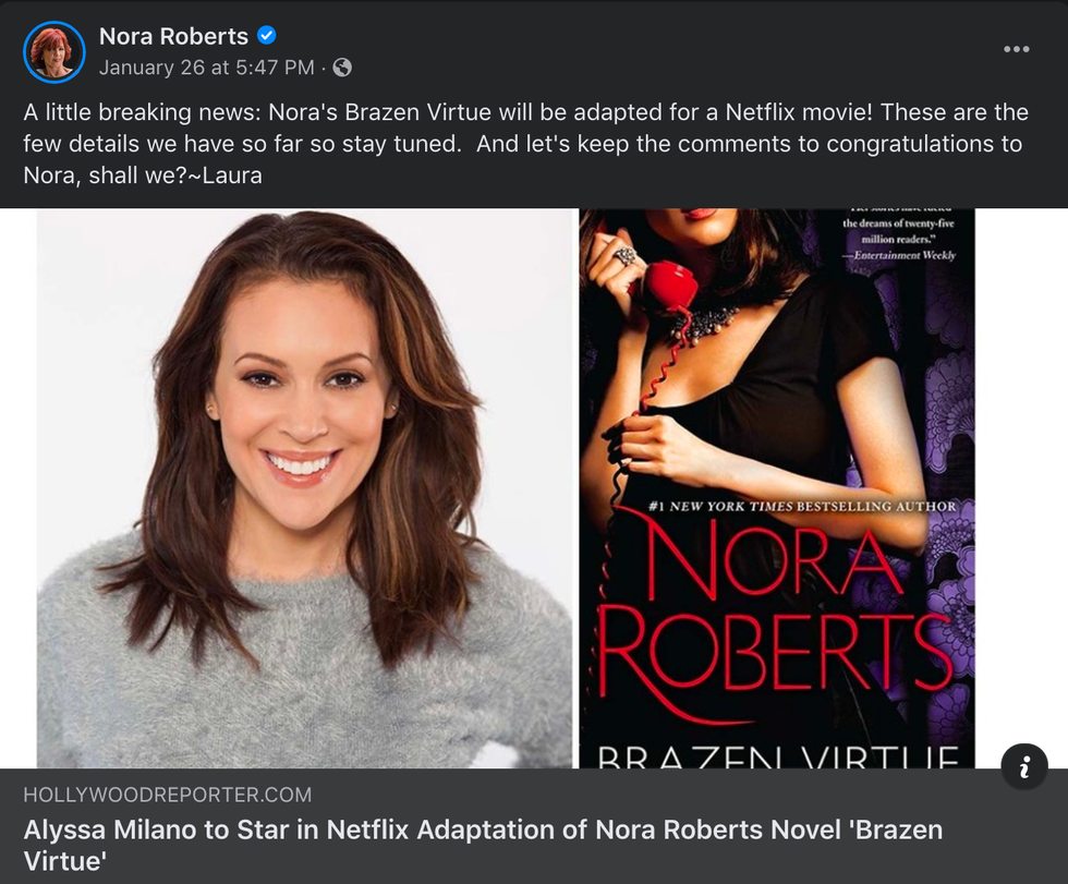"I've read many of the comments on Laura's announcement of the Brazen Virtue adaption for Netflix, starring Allysa Milano," wrote Roberts, adding, "And I'm simply and sincerely appalled."