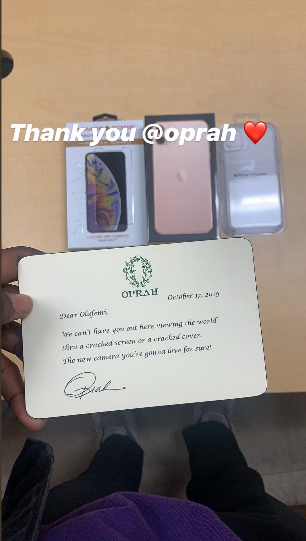 A college freshman in Atlanta had the honor of filming a video selfie with the inspirational media mogul on his broken camera phone, and Oprah teased him about the cracked screen.