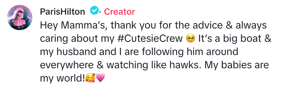 "Hey Mamma’s, thank you for the advice & always caring about my #CutesieCrew 🥺 It’s a big boat & my husband and I are following him around everywhere & watching like hawks," she wrote in the comments, adding: