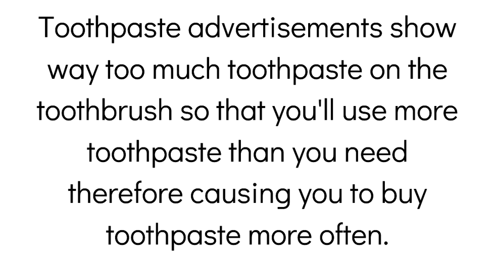 Toothpaste advertisements show way too much toothpaste on the toothbrush so that you'll use more toothpaste than you need therefore causing you to buy toothpaste more often.