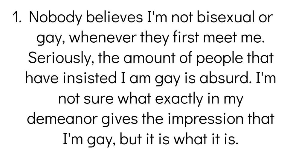Nobody believes I'm not bisexual or gay, whenever they first meet me. Seriously, the amount of people that have insisted I am gay is absurd. I'm not sure what exactly in my demeanor gives the impression that I'm gay, but it is what it is.