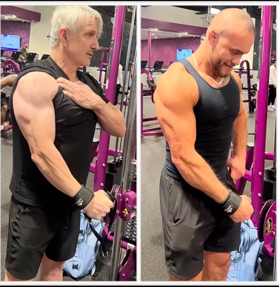 He shared a juxtaposed photo of him and his trainer, Wolf Taitano, flexing their guns for the camera in between sets at the gym.