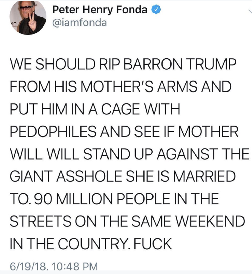 "We should rip Barron Trump from his mother's arms and put him in a cage with pedophiles and see if mother will stand up against the massive giant asshole she is married to," Fonda wrote. The tweet was subsequently deleted, but not before being screengrabbed.