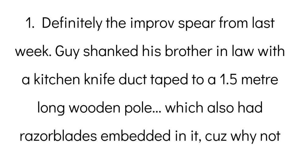 Definitely the improv spear from last week. Guy shanked his brother in law with a kitchen knife duct taped to a 1.5 metre long wooden pole... which also had razorblades embedded in it, cuz why not