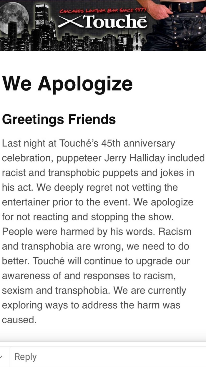 Touché bar managers issued a statement apologizing for not having vetted the performer before booking him and addressing both the racism and transphobia Halliday incorporated into another part of his act.