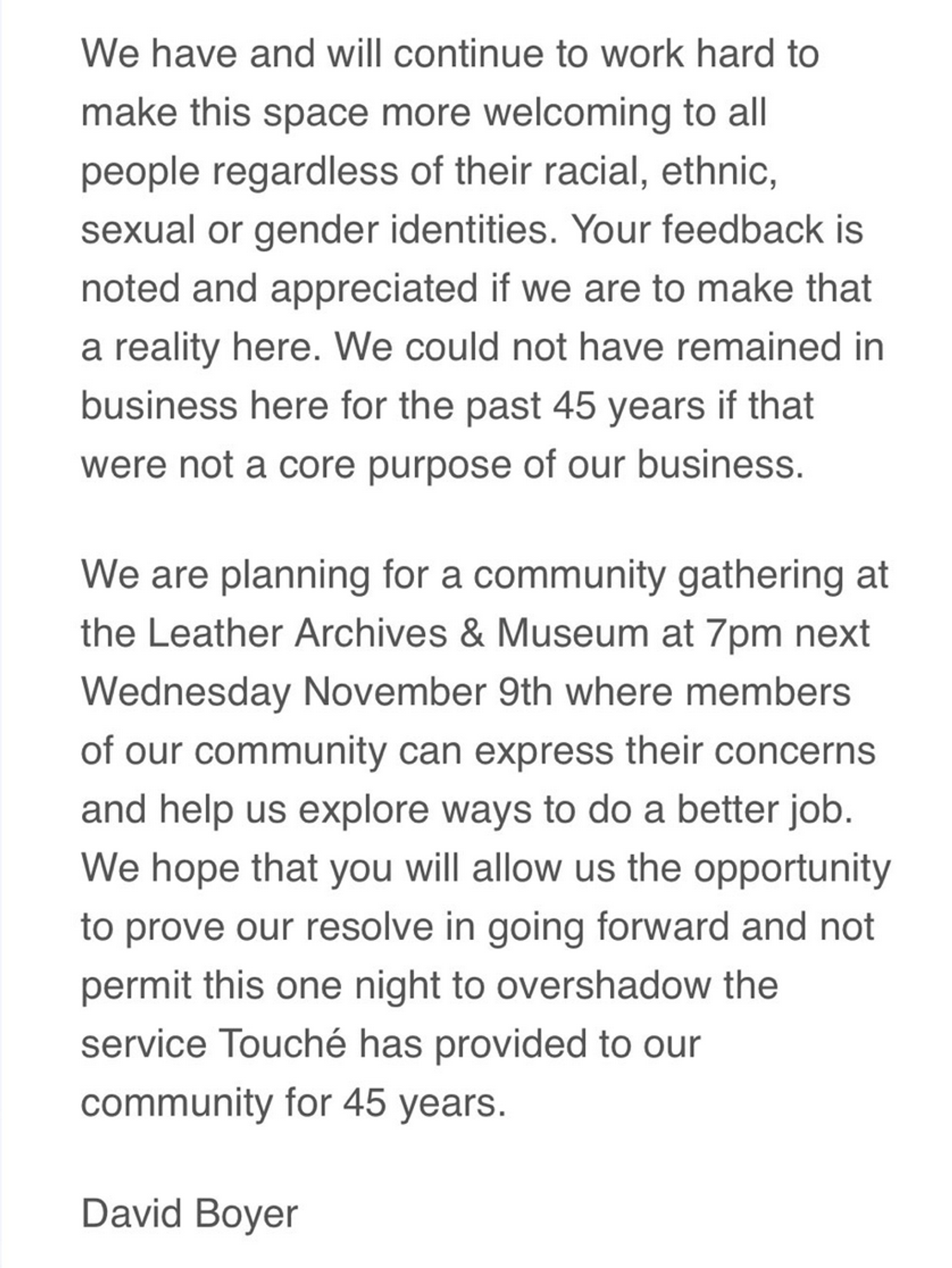 The bar's leaders also hosted a town hall at the Leather Archives and Museum on Wednesday night, which allowed members of the community to express their concerns.