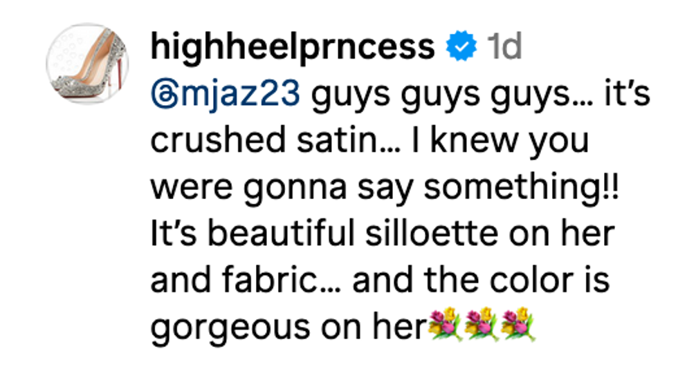 "Guys guys guys… It’s crushed satin… I knew you were gonna say something!! It’s beautiful silloette [sic] on her and fabric… and the color is gorgeous on her."