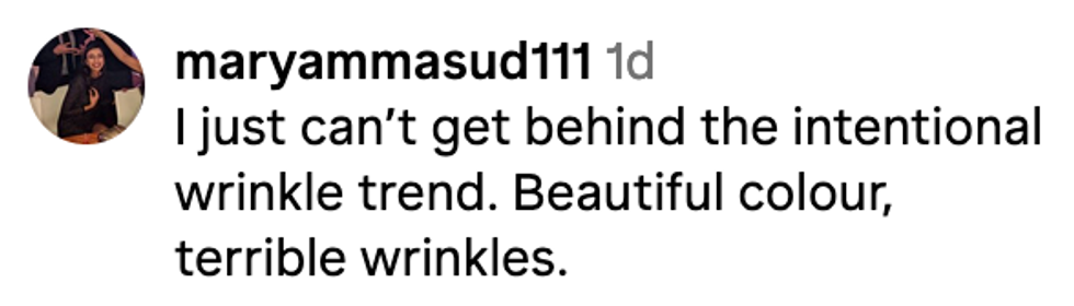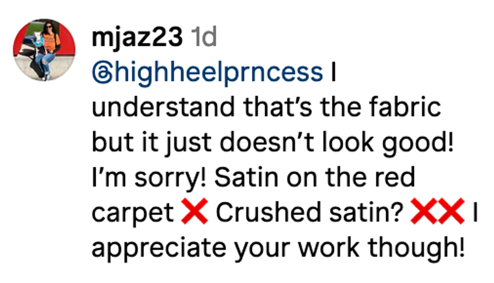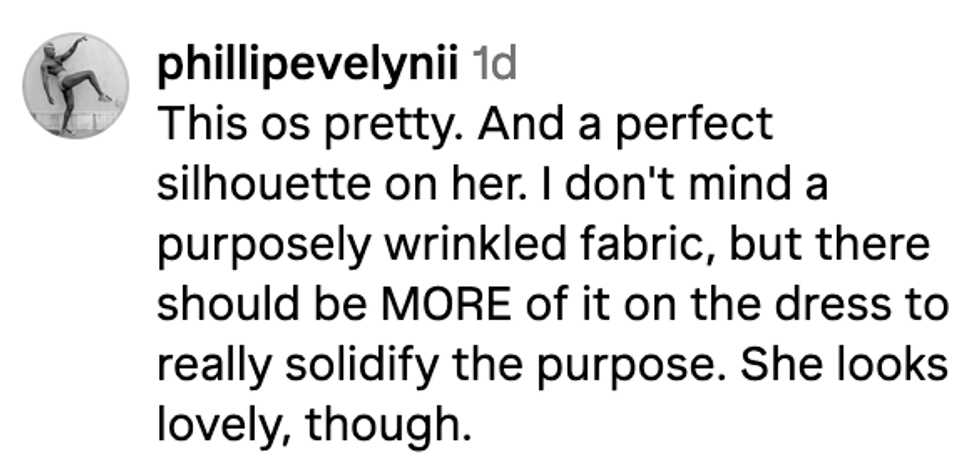 In response to a critic who said the look was a "huge miss" and how "rumpled fabric" would "never read anything other than a mess" on the red carpet, Paster tried to mitigate the criticism.