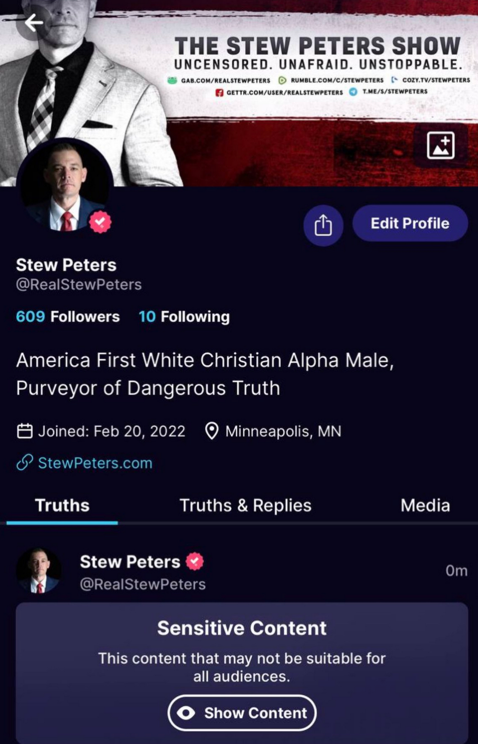 Peters–whose Truth Social description reads, "America First White Christian Alpha Male, Purveyor of Dangerous Truth"–complained on the messaging app, Telegram, after he was shown a "sensitive content" warning.