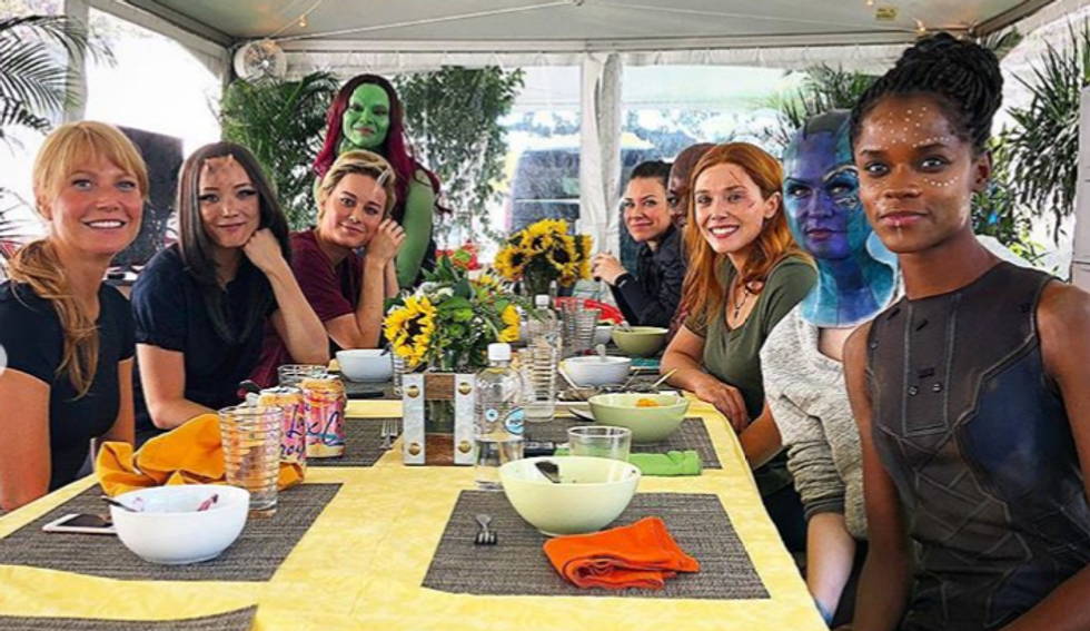 The cast members are in various states of wardrobe and personal clothing mixed together. It's obvious the lunch was held in between scenes. Gamora (Zoe Saldana), Shuri (Letitia Wright) and Okoye (Danai Gurira) look like they could hit the set again with just a few touch ups.