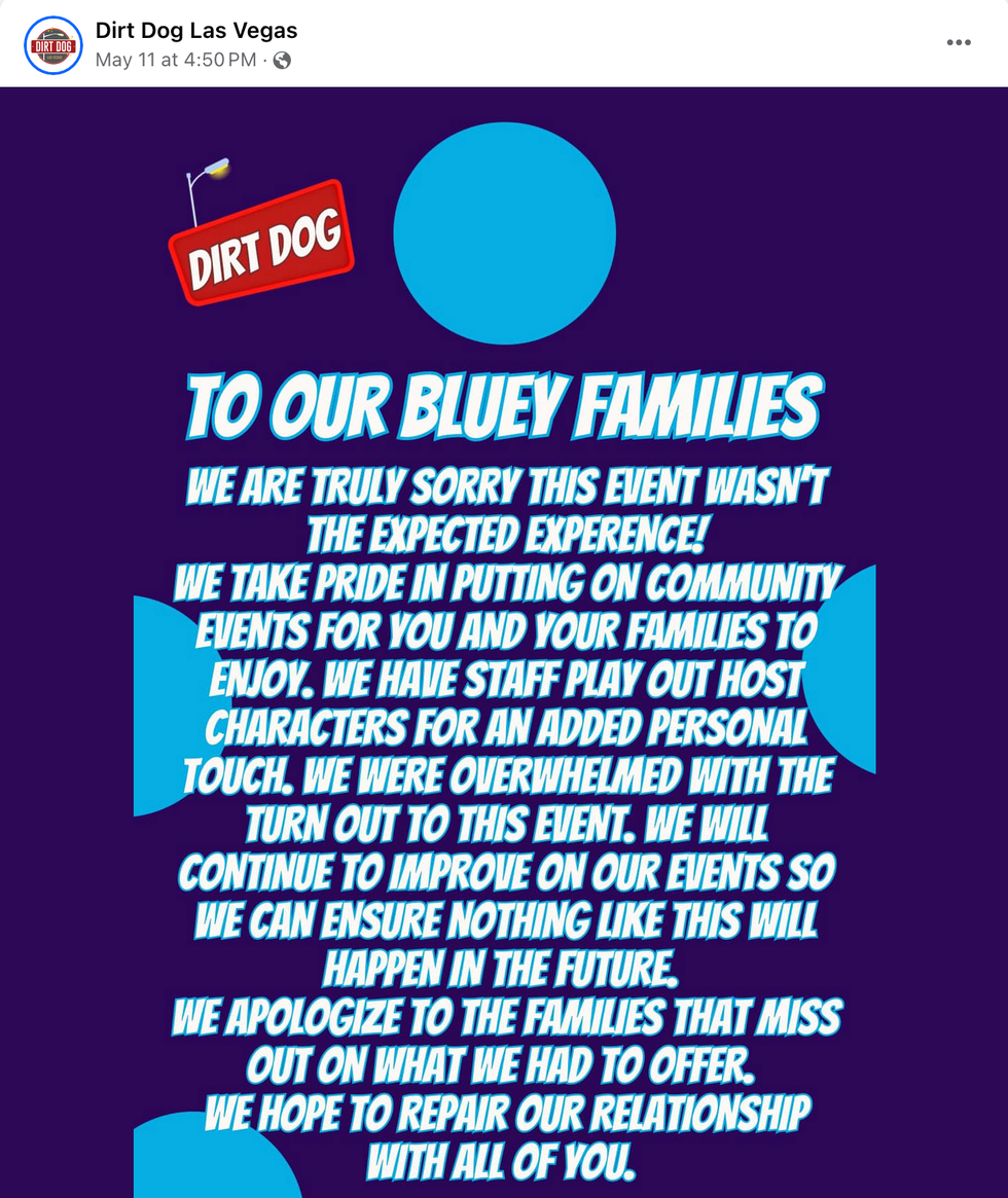 A Las Vegas location of the West Coast hot dog chain, known for their gourmet hot dogs with a "hip-hop edge," got roasted for hosting a massively hyped event that failed to meet the expectations of young Bluey fans.