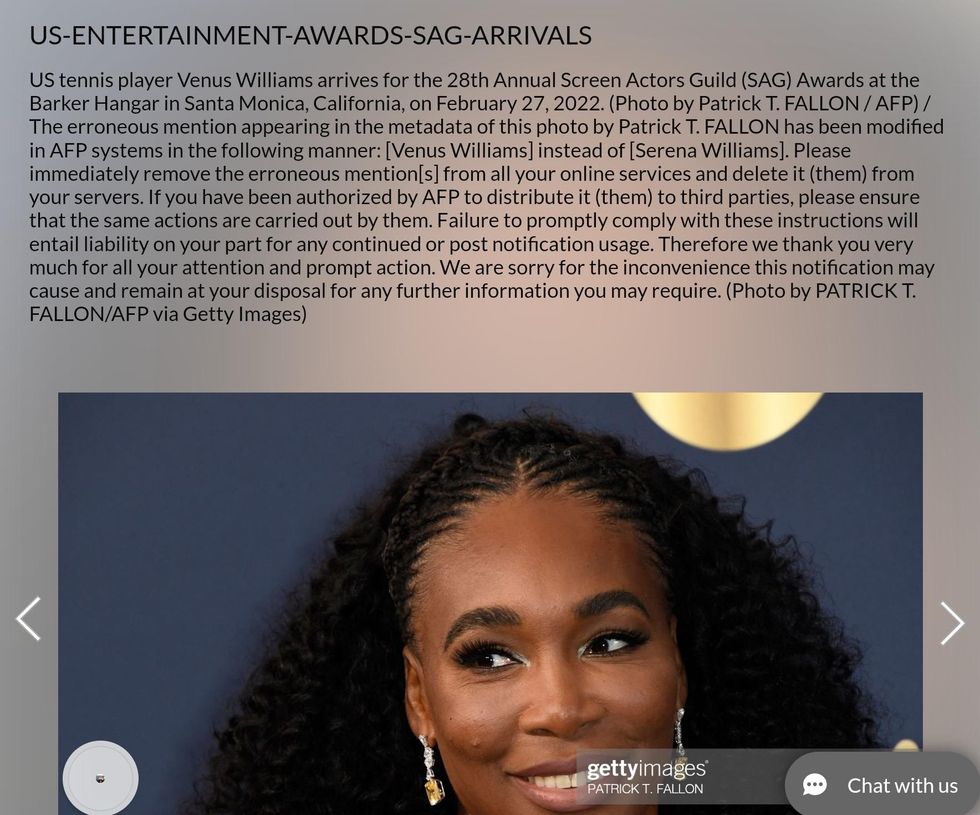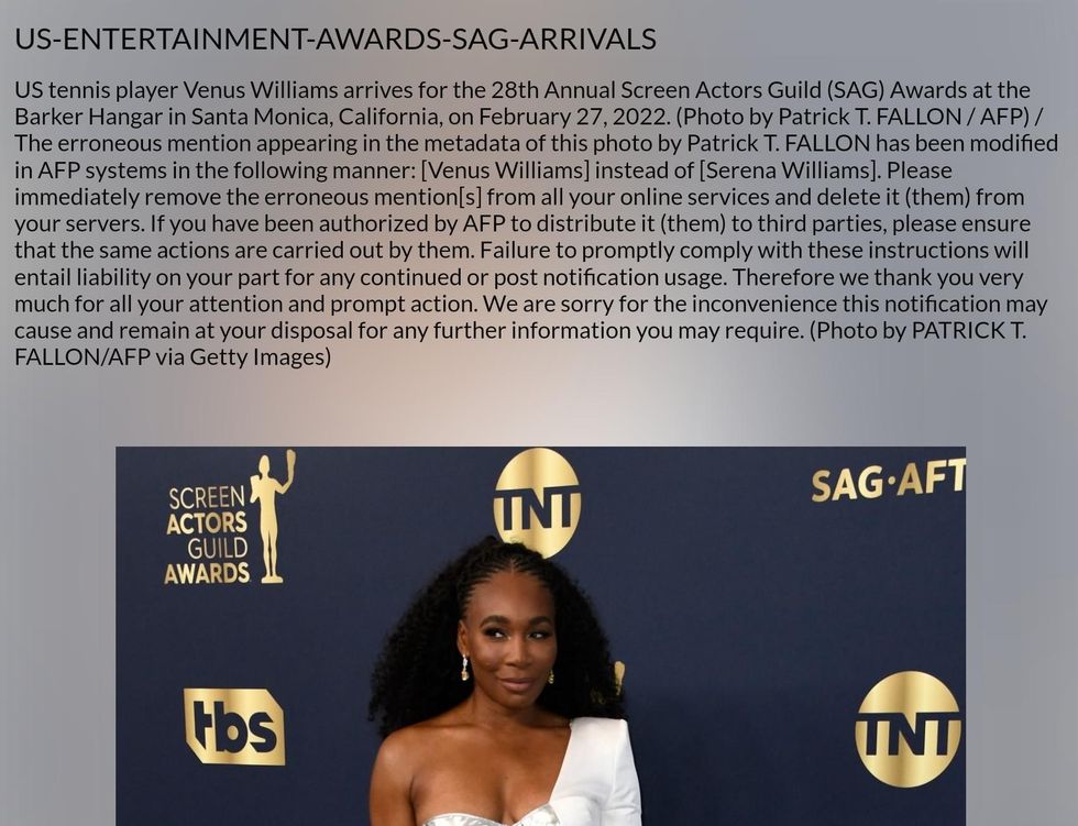 Two photos of Venus Williams' February 27, 2022 arrival at the SAG Awards were misidentified as Serena Williams.