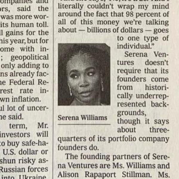 No matter how far we come, we get reminded that it's not enough. This is why I raised $111M for @serenaventures. To support the founders who are overlooked by engrained systems woefully unaware of their biases. Because even I am overlooked. You can do better, @nytimes.pic.twitter.com/hvfCl5WUoz— Serena Williams (@Serena Williams) 1646238273