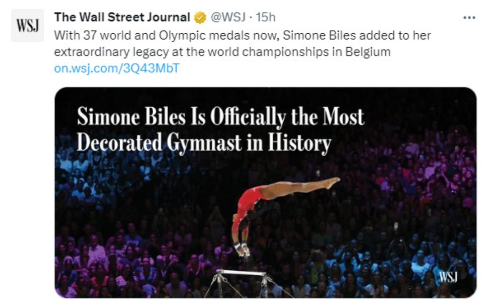 With 37 world and Olympic medals now, Simone Biles added to her extraordinary legacy at the world championships in Belgium (the photo in an earlier post, now deleted, misidentified a gymnast as Simone Biles) https://t.co/vjWMZVLQGi— The Wall Street Journal (@The Wall Street Journal) 1696845948