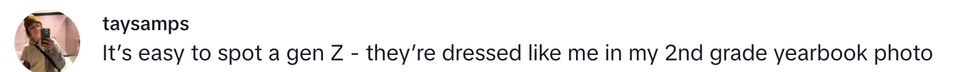 The TikToker shared with BuzzFeed that she recently learned from some other TikToks that tucking one's shirt in the front only is a trend only Millennials still follow. Other videos reveal style choices such as side parts, skinny jeans and no-show socks are instant identifiers.