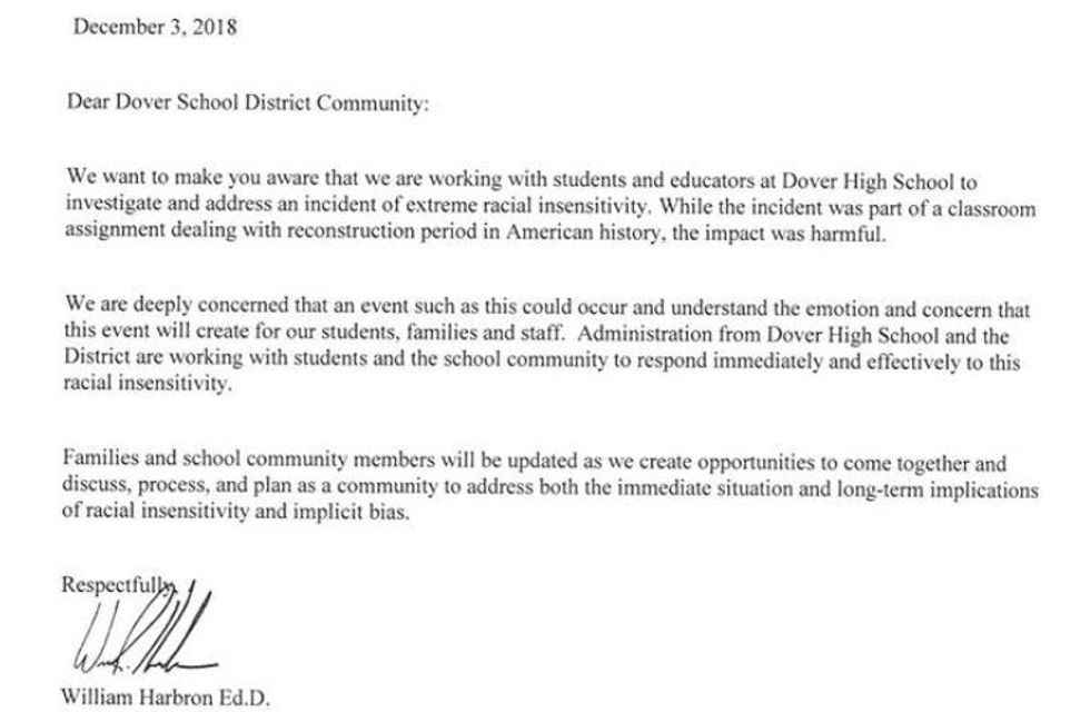 Dover School District Superintendent William Harbron told NBC News that the assignment was given out for U.S. history class and the students came up with the lyrics:
