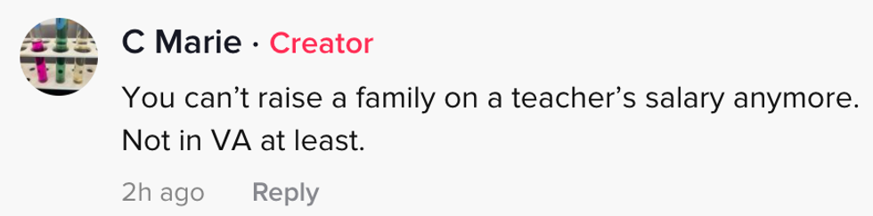 One of the reasons she cited was being unable to support her family on a teacher's salary.