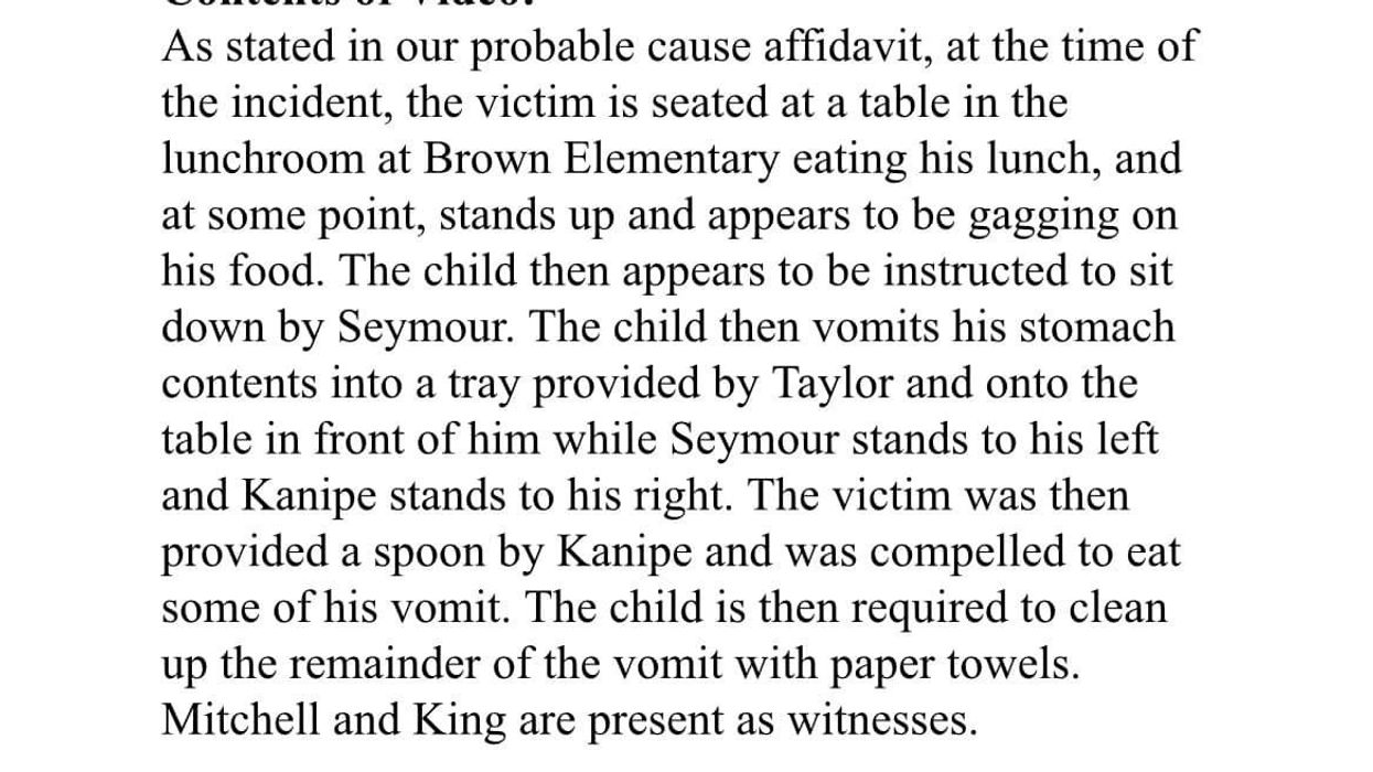“As indicated in our probable cause affidavit, through the course of various interviews, and the review of other evidence, Seymour is said to have allegedly advised the victim that if he vomited, he would be required to eat what he threw up.”