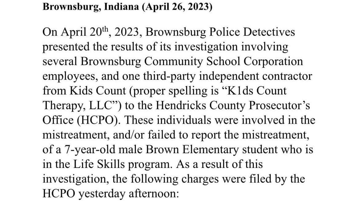 Upon learning about the incident, the Brownsburg Community School Corporation put all of their staff on administrative leave while the police could investigate. One individual worked for a third party—Kids Count—so they were banned from school property.