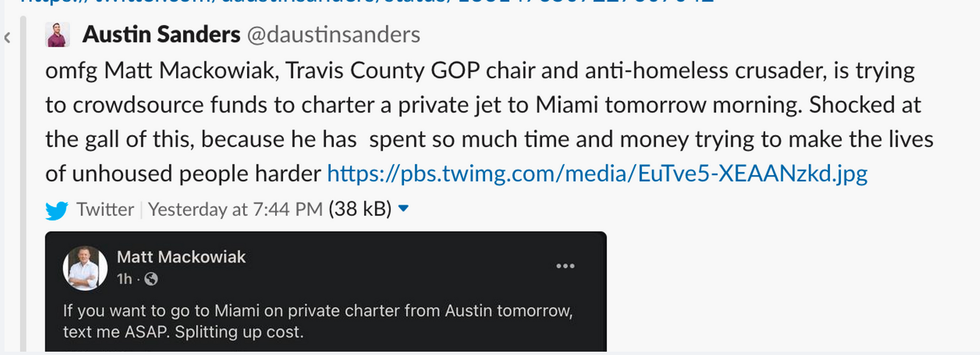 "omfg Matt Mackowiak, Travis County GOP chair and anti-homeless crusader, is trying to crowdsource funds to charter a private jet to Miami tomorrow morning."