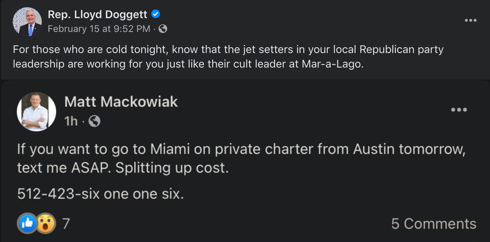 A GOP Chairman in Austin, Texas, who endeavors to criminalize homelessness in his city was caught asking Facebook followers to help him charter a jet to Miami, Florida, as many Texans are left freezing during the statewide power outages.
